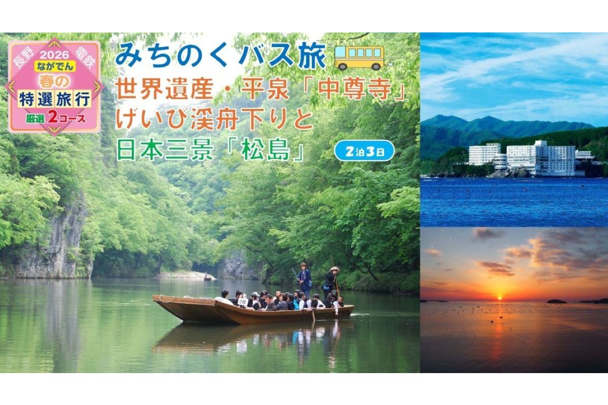 ながでん春の特選旅行「みちのくバス旅 世界遺産 平泉「中尊寺」、げいび渓舟下りと日本三景「松島」2泊3日」