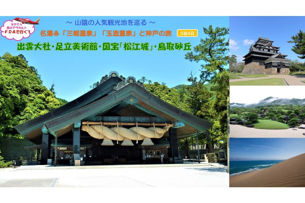 山陰の人気観光地「出雲大社」「足立美術館」「国宝・松江城」「鳥取砂丘」を巡り、名湯♨「三朝温泉」と「玉造温泉」に宿泊!