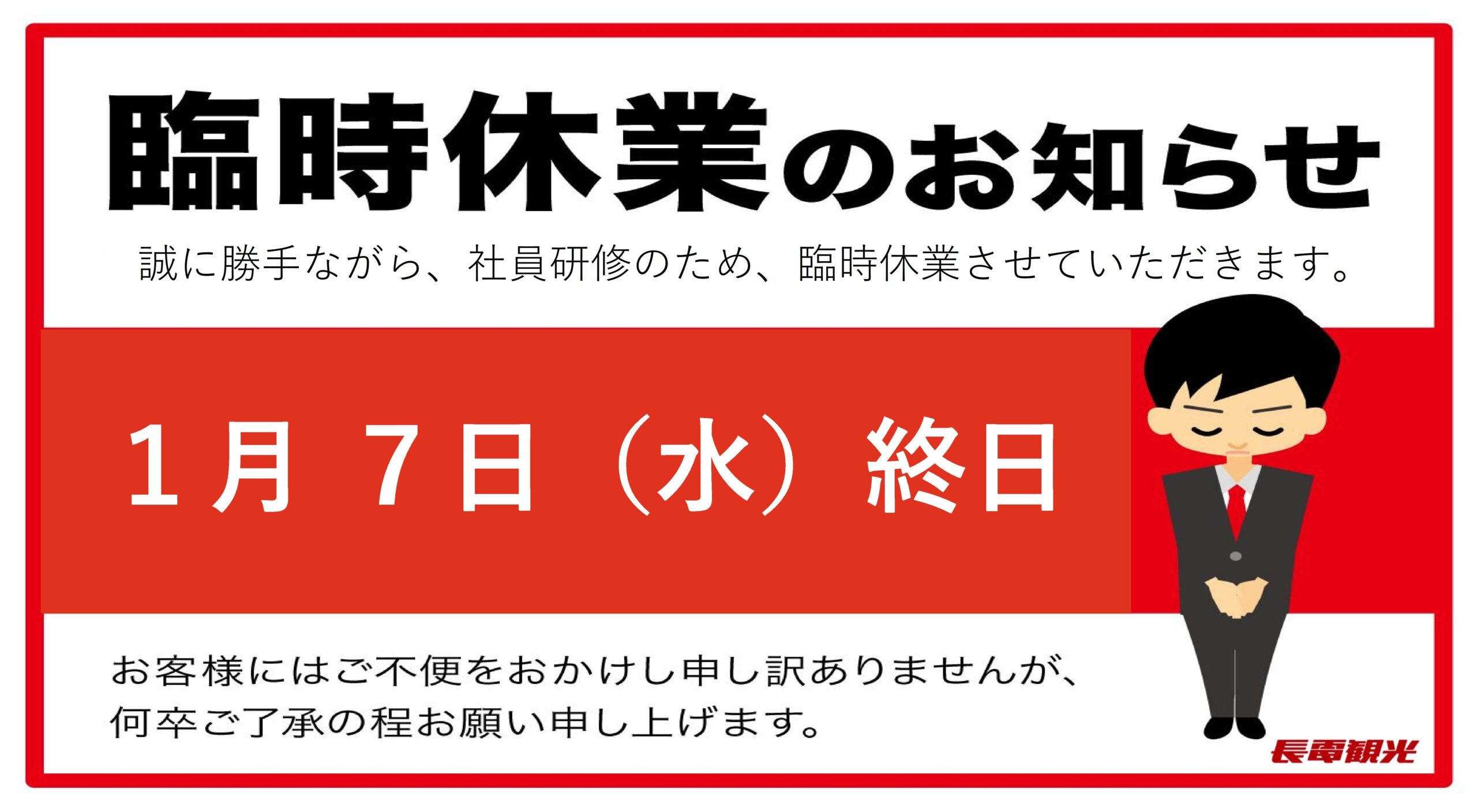 ~臨時休業のお知らせ~ 毎度当店をご利用いただきましてありがとうございます。 誠に勝手ながら、社員研修に伴い下記日程にて臨時休業いたします。 ご不便をおかけしますが何卒ご理解の程よろしくお願い申し上げます。 2026年 1月7日(水) 終日休業 ホームページからの申込・問い合わせをいただきました件につきましては、 翌営業日以降に順次ご返信をさせていただきます。